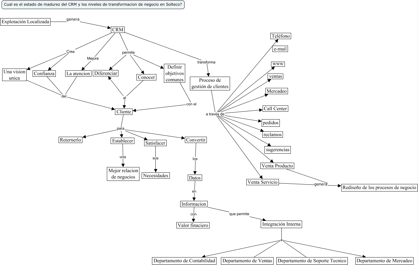 Este Cmap, tiene información relacionada con: CRM, Proceso de gestión de clientes a través de sugerencias, Cliente para Establecer, Informacion que permite Integración Interna, CRM Mejora La atencion, Explotación Localizada genera CRM, Proceso de gestión de clientes a través de Teléfono, Establecer una Mejor relacion de negocios, Integración Interna a Departamento de Mercadeo, Datos en Informacion, Satisfacer sus Necesidades, Integración Interna a Departamento de Soporte Tecnico, Proceso de gestión de clientes a través de Venta Producto, Informacion con Valor finaciero, Proceso de gestión de clientes a través de Mercadeo, CRM transforma Proceso de gestión de clientes, Venta Producto genera Rediseño de los procesos de negocio, CRM permite Definir objetivos comunes, Conocer al Cliente, La atencion del Cliente, Proceso de gestión de clientes a través de reclamos
