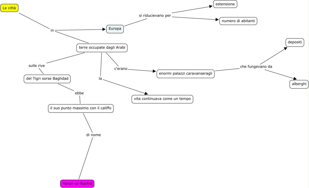 Questa Cmap, creata con IHMC CmapTools, contiene informazioni relative a: 13 ... E fioriscono le città, il suo punto massimo con il califfo di nome Harun-ar-Rashid, del Tigri sorse Baghdad ebbe il suo punto massimo con il califfo, Europa si riducievano per numero di abitanti, enormi palazzi caravanseragli che fungevano da alberghi, terre occupate dagli Arabi la vita continuava come un tempo, Le città in terre occupate dagli Arabi, terre occupate dagli Arabi sulle rive del Tigri sorse Baghdad, enormi palazzi caravanseragli che fungevano da depositi, terre occupate dagli Arabi c'erano enormi palazzi caravanseragli, Le città in Europa, Europa si riducievano per estensione