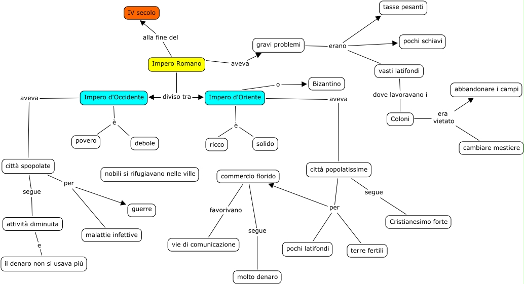 Questa Cmap, creata con IHMC CmapTools, contiene informazioni relative a: 1 Impero romano diviso, Impero Romano diviso tra Impero d'Oriente, Impero d'Oriente è solido, città popolatissime segue Cristianesimo forte, gravi problemi erano tasse pesanti, Coloni era vietato abbandonare i campi, commercio florido favorivano vie di comunicazione, Impero d'Occidente aveva città spopolate, Coloni era vietato cambiare mestiere, città popolatissime per terre fertili, gravi problemi erano pochi schiavi, città popolatissime per commercio florido, Impero Romano aveva gravi problemi, città spopolate per malattie infettive, Impero d'Oriente è ricco, Impero d'Occidente è debole, vasti latifondi dove lavoravano i Coloni, Impero d'Occidente è povero, Impero d'Oriente aveva città popolatissime, commercio florido segue molto denaro, attività diminuita e il denaro non si usava più