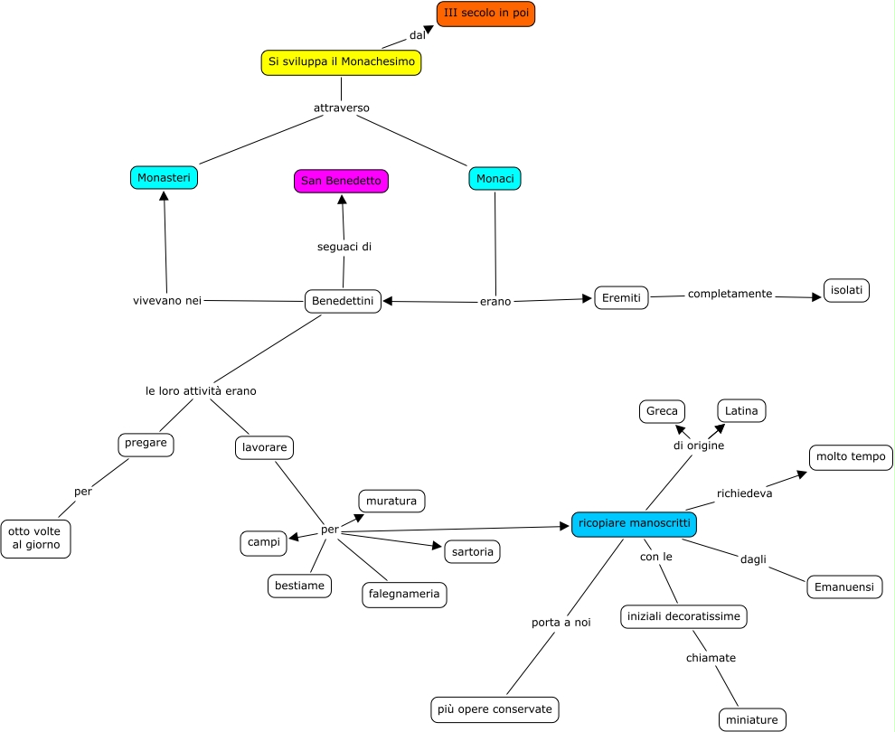 Questa Cmap, creata con IHMC CmapTools, contiene informazioni relative a: 8 Si sviluppa il Monachesimo, ricopiare manoscritti dagli Emanuensi, Monaci erano Eremiti, ricopiare manoscritti di origine Latina, Si sviluppa il Monachesimo attraverso Monaci, Benedettini le loro attività erano lavorare, ricopiare manoscritti di origine Greca, lavorare per bestiame, ricopiare manoscritti porta a noi più opere conservate, lavorare per campi, Si sviluppa il Monachesimo dal III secolo in poi, lavorare per falegnameria, Eremiti completamente isolati, pregare per otto volte al giorno, ricopiare manoscritti con le iniziali decoratissime, lavorare per muratura, Benedettini le loro attività erano pregare, Benedettini seguaci di San Benedetto, Si sviluppa il Monachesimo attraverso Monasteri, ricopiare manoscritti di origine Latina, ricopiare manoscritti richiedeva molto tempo