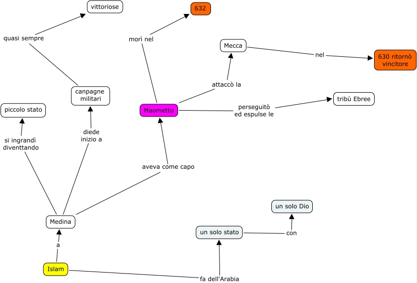 Questa Cmap, creata con IHMC CmapTools, contiene informazioni relative a: 05 L'Islam fa dell'Arabia un solo stato con un solo Dio, Maometto attaccò la Mecca, un solo stato con un solo Dio, Maometto perseguitò ed espulse le tribù Ebree, Medina diede inizio a canpagne militari, Medina aveva come capo Maometto, Islam fa dell'Arabia un solo stato, Mecca nel 630 ritornò vincitore, canpagne militari quasi sempre vittoriose, Maometto morì nel 632, Medina si ingrandì diventtando piccolo stato, Islam a Medina