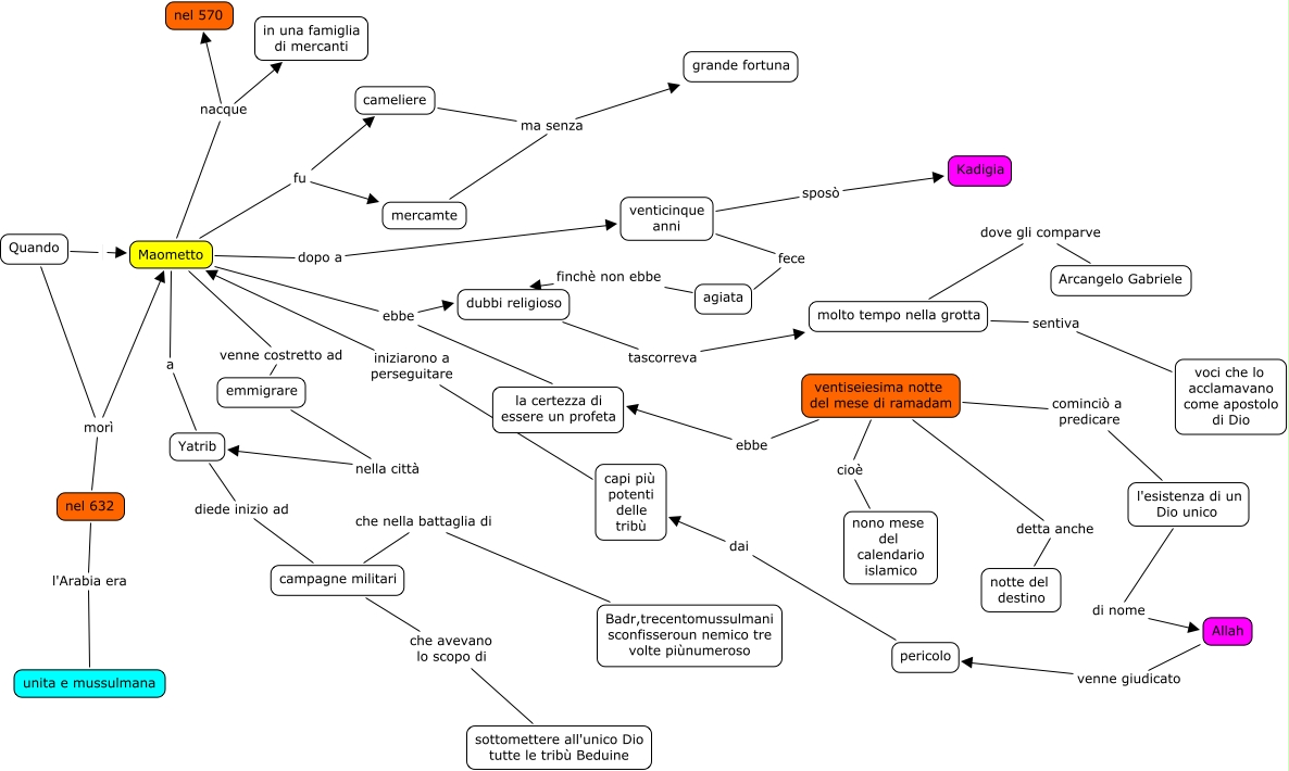 Questa Cmap, creata con IHMC CmapTools, contiene informazioni relative a: 06 Maometo,il profeta di Allah, dubbi religioso tascorreva molto tempo nella grotta, ventiseiesima notte del mese di ramadam cominciò a predicare l'esistenza di un Dio unico, mercamte ma senza grande fortuna, Quando morì Maometto, Maometto nacque nel 570, agiata finchè non ebbe dubbi religioso, pericolo dai capi più potenti delle tribù, Maometto fu mercamte, Maometto fu cameliere, Allah venne giudicato pericolo, capi più potenti delle tribù iniziarono a perseguitare Maometto, nel 632 l'Arabia era unita e mussulmana, venticinque anni sposò Kadigia, Maometto venne costretto ad emmigrare, Maometto ebbe dubbi religioso, Maometto nacque in una famiglia di mercanti, Maometto a Yatrib, ventiseiesima notte del mese di ramadam ebbe la certezza di essere un profeta, venticinque anni fece agiata, molto tempo nella grotta sentiva voci che lo acclamavano come apostolo di Dio