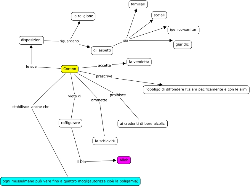 Questa Cmap, creata con IHMC CmapTools, contiene informazioni relative a: 09 Alte prescrizioni del Corano, Corano proibisce ai credenti di bere alcolici, Corano stabilisce anche che ogni mussulmano può vere fino a quattro mogli(autorizza cioè la poligamia), raffigurare il Dio Allah, Corano accetta la vendetta, gli aspetti sia familiari, Corano prescrive l'obbligo di diffondere l'Islam pacificamente e con le armi, Corano ammette la schiavitù, Corano vieta di raffigurare, disposizioni riguardano gli aspetti, gli aspetti sia giuridici, Corano le sue disposizioni, gli aspetti sia sociali, gli aspetti sia igenico-sanitari, disposizioni riguardano la religione