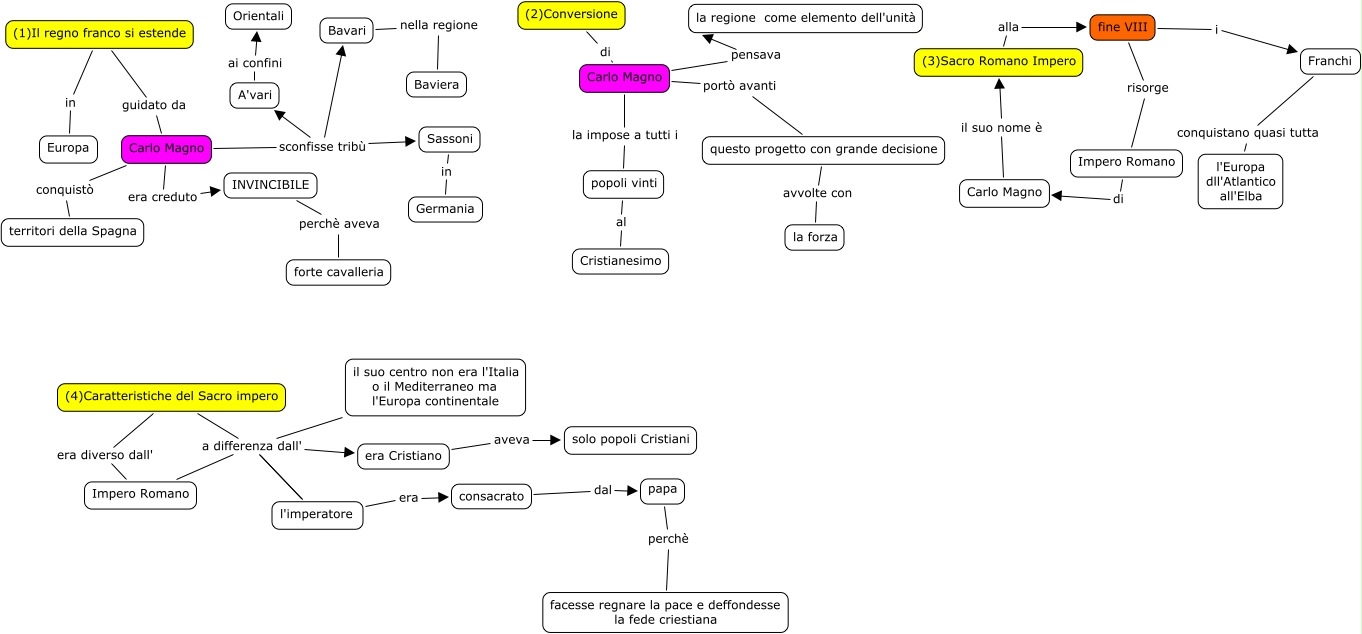 Questa Cmap, creata con IHMC CmapTools, contiene informazioni relative a: 2 Il regno Franco si estende in Europa, (1)Il regno franco si estende guidato da Carlo Magno, Carlo Magno era creduto INVINCIBILE, consacrato dal papa, Bavari nella regione Baviera, A'vari ai confini Orientali, (4)Caratteristiche del Sacro impero a differenza dall' era Cristiano, (2)Conversione di Carlo Magno, papa perchè facesse regnare la pace e deffondesse la fede criestiana, era Cristiano aveva solo popoli Cristiani, Carlo Magno portò avanti questo progetto con grande decisione, (3)Sacro Romano Impero alla fine VIII, il suo centro non era l'Italia o il Mediterraneo ma l'Europa continentale a differenza dall' l'imperatore, fine VIII i Franchi, Carlo Magno sconfisse tribù Bavari, il suo centro non era l'Italia o il Mediterraneo ma l'Europa continentale a differenza dall' Impero Romano, l'imperatore era consacrato, Impero Romano di Carlo Magno, (4)Caratteristiche del Sacro impero a differenza dall' l'imperatore, Franchi conquistano quasi tutta l'Europa dll'Atlantico all'Elba, popoli vinti al Cristianesimo