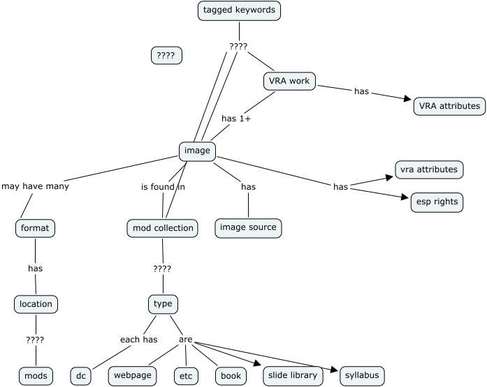 This Concept Map has information related to: 531_final, type each has dc, tagged keywords ???? VRA work, type are slide library, image is found in mod collection, image has vra attributes, tagged keywords ???? mod collection, type are syllabus, format has location, VRA work has 1+ image, type are webpage