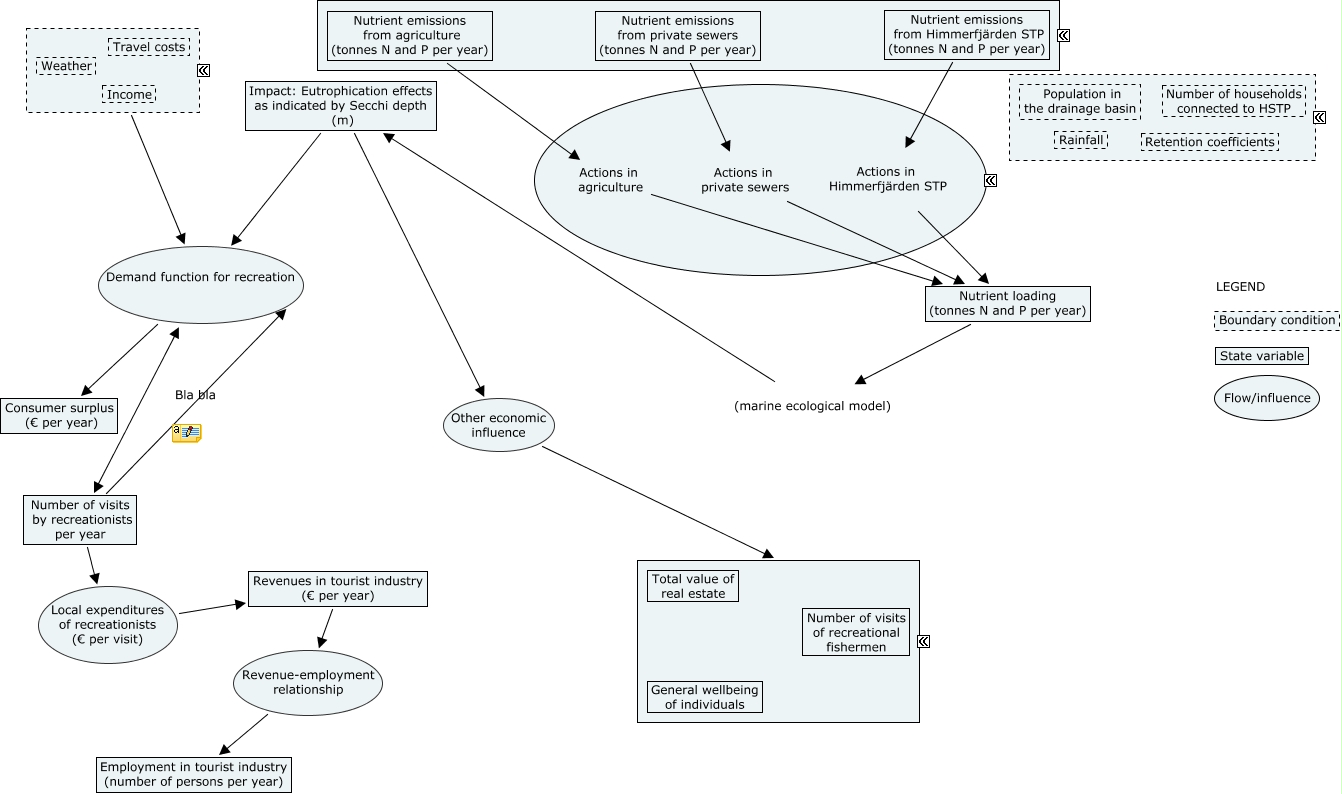 Den här kartan innehåller information om: Economic_2, Number of visits by recreationists per year Local expenditures of recreationists (€ per visit) Revenues in tourist industry (€ per year), Nutrient emissions from agriculture (tonnes N and P per year) Actions in agriculture Nutrient loading (tonnes N and P per year), Revenues in tourist industry (€ per year) Revenue-employment relationship Employment in tourist industry (number of persons per year), Nutrient loading (tonnes N and P per year) (marine ecological model) Impact: Eutrophication effects as indicated by Secchi depth (m), Number of visits by recreationists per year Demand function for recreation Consumer surplus (€ per year), Nutrient emissions from Himmerfjärden STP (tonnes N and P per year) Actions in Himmerfjärden STP Nutrient loading (tonnes N and P per year), Impact: Eutrophication effects as indicated by Secchi depth (m) Demand function for recreation Number of visits by recreationists per year, Nutrient emissions from private sewers (tonnes N and P per year) Actions in private sewers Nutrient loading (tonnes N and P per year), Impact: Eutrophication effects as indicated by Secchi depth (m) Other economic influence Other economic state variables, Boundary conditions for recreational demand Demand function for recreation Consumer surplus (€ per year), Boundary conditions for recreational demand Demand function for recreation Number of visits by recreationists per year, Impact: Eutrophication effects as indicated by Secchi depth (m) Demand function for recreation Consumer surplus (€ per year)