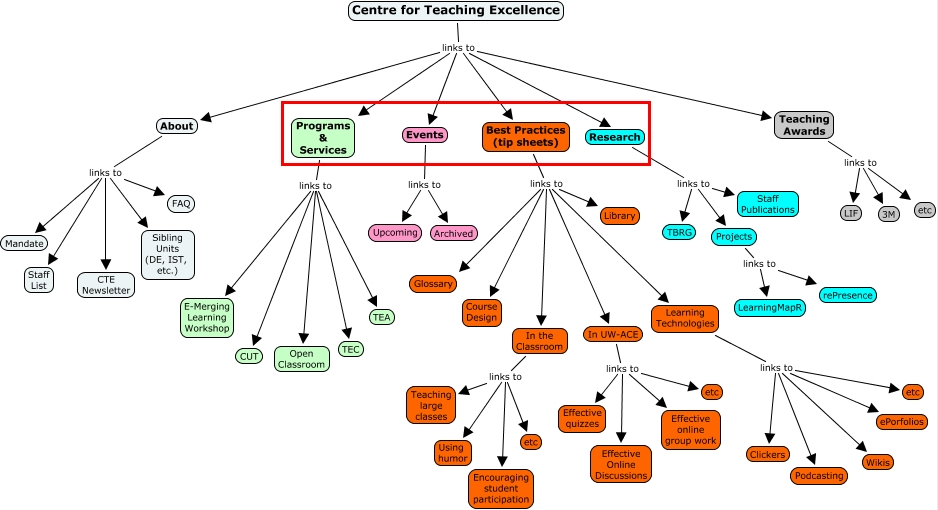 This Concept Map, created with IHMC CmapTools, has information related to: CTE-ORG1, In UW-ACE links to Effective Online Discussions, Best Practices (tip sheets) links to Course Design, Programs & Services links to TEA, Learning Technologies links to Clickers, Centre for Teaching Excellence links to Events, About links to FAQ, Research links to Staff Publications, About links to Staff List, Centre for Teaching Excellence links to Research, Centre for Teaching Excellence links to About, Best Practices (tip sheets) links to In UW-ACE, Programs & Services links to TEC, Best Practices (tip sheets) links to Glossary, Best Practices (tip sheets) links to Library, Programs & Services links to Open Classroom, In the Classroom links to Using humor, Learning Technologies links to etc, Research links to TBRG, Research links to Projects, In the Classroom links to Encouraging student participation
