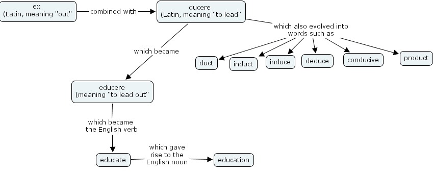 ex (Latin, meaning "out" combined with ducere (Latin, meaning "to lead", ducere (Latin, meaning "to lead" which became educere (meaning "to lead out", ducere (Latin, meaning "to lead" which also evolved into words such as duct, ducere (Latin, meaning "to lead" which also evolved into words such as induce, ducere (Latin, meaning "to lead" which also evolved into words such as product, ducere (Latin, meaning "to lead" which also evolved into words such as conducive, ducere (Latin, meaning "to lead" which also evolved into words such as induct, ducere (Latin, meaning "to lead" which also evolved into words such as deduce, educere (meaning "to lead out" which became the English verb educate, educate which gave rise to the English noun education