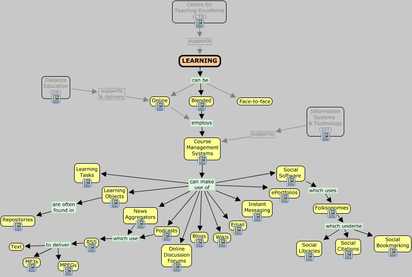 This Concept Map, created with IHMC CmapTools, has information related to: glossary, Course Management Systems can make use of Blogs, Folksonomies which underlie Social Bookmarking, LEARNING can be Online, Course Management Systems can make use of Online Discussion Forums, RSS to deliver Text, Folksonomies which underlie Social Libraries, Folksonomies which underlie Social Citations, Course Management Systems can make use of Email, Course Management Systems can make use of Instant Messaging, Course Management Systems can make use of Podcasts, Course Management Systems can make use of Learning Tasks, Centre for Teaching Excellence (CTE) supports LEARNING, Blended employs Course Management Systems, RSS to deliver MPEGs, Distance Education (DE) supports & delivers Online, Social Software which uses Folksonomies, Course Management Systems can make use of ePortfolios, Learning Objects are often found in Repositories, Course Management Systems can make use of Wikis, Podcasts which use RSS