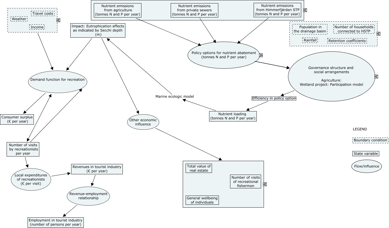 Den här kartan innehåller information om: Economic_social, Revenues in tourist industry (€ per year) Revenue-employment relationship Employment in tourist industry (number of persons per year), Number of visits by recreationists per year Local expenditures of recreationists (€ per visit) Revenues in tourist industry (€ per year), Nutrient loading (tonnes N and P per year) Marine ecologic model Impact: Eutrophication effects as indicated by Secchi depth (m), Impact: Eutrophication effects as indicated by Secchi depth (m) Demand function for recreation Number of visits by recreationists per year, Number of visits by recreationists per year Demand function for recreation Consumer surplus (€ per year), Nutrient emissions from private sewers (tonnes N and P per year) Actions in private sewers Governance structure and social arrangements, Impact: Eutrophication effects as indicated by Secchi depth (m) Other economic influence Other economic state variables, Nutrient emissions from Himmerfjärden STP (tonnes N and P per year) Actions in Himmerfjärden STP Governance structure and social arrangements, Boundary conditions for recreational demand Demand function for recreation Consumer surplus (€ per year), Nutrient emissions from agriculture (tonnes N and P per year) Actions in agriculture Governance structure and social arrangements, Boundary conditions for recreational demand Demand function for recreation Number of visits by recreationists per year, Impact: Eutrophication effects as indicated by Secchi depth (m) Demand function for recreation Consumer surplus (€ per year), Governance structure and social arrangements Efficiency in policy option Nutrient loading (tonnes N and P per year)