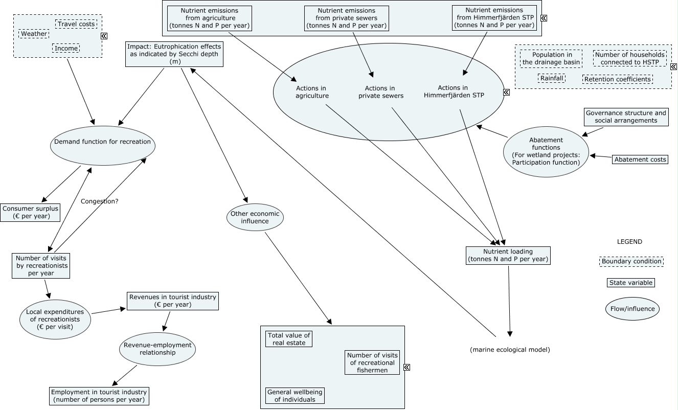 Den här kartan innehåller information om: Economic_Social_2, Revenues in tourist industry (€ per year) Revenue-employment relationship Employment in tourist industry (number of persons per year), Nutrient emissions from agriculture (tonnes N and P per year) Actions in agriculture Nutrient loading (tonnes N and P per year), Number of visits by recreationists per year Local expenditures of recreationists (€ per visit) Revenues in tourist industry (€ per year), Nutrient loading (tonnes N and P per year) (marine ecological model) Impact: Eutrophication effects as indicated by Secchi depth (m), Governance structure and social arrangements Abatement functions (For wetland projects: Participation function) Nutrient abatement (tonnes N and P per year), Impact: Eutrophication effects as indicated by Secchi depth (m) Demand function for recreation Number of visits by recreationists per year, Nutrient emissions from Himmerfjärden STP (tonnes N and P per year) Actions in Himmerfjärden STP Nutrient loading (tonnes N and P per year), Number of visits by recreationists per year Demand function for recreation Consumer surplus (€ per year), Impact: Eutrophication effects as indicated by Secchi depth (m) Other economic influence Other economic state variables, Nutrient emissions from private sewers (tonnes N and P per year) Actions in private sewers Nutrient loading (tonnes N and P per year), Boundary conditions for recreational demand Demand function for recreation Consumer surplus (€ per year), Boundary conditions for recreational demand Demand function for recreation Number of visits by recreationists per year, Impact: Eutrophication effects as indicated by Secchi depth (m) Demand function for recreation Consumer surplus (€ per year), Abatement costs Abatement functions (For wetland projects: Participation function) Nutrient abatement (tonnes N and P per year)