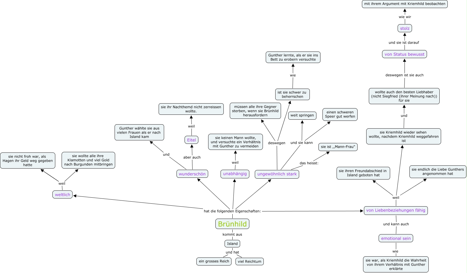 This Concept Map, created with IHMC CmapTools, has information related to: Bruenhild, sie Kriemhild wieder sehen wollte, nachdem Kriemhild weggefahren ist und wollte auch den besten Liebhaber (nicht Siegfried (ihrer Meinung nach)) für sie, wunderschön aber auch Eitel, stolz wie wir mit ihrem Argument mit Kriemhild beobachten, ungewöhnlich stark deswegen müssen alle ihre Gegner sterben, wenn sie Brünhild herausfordern, ungewöhnlich stark das heisst: sie ist ,,Mann-Frau", Brünhild hat die folgenden Eigenschaften: unabhängig, von Liebenbeziehungen fähig weil sie ihren Freundabschied in Island geboten hat, unabhängig weil sie keinen Mann wollte, und versuchte ein Verhältnis mit Gunther zu vermeiden, Island und hat ein grosses Reich, weltlich weil sie nicht froh war, als Hagen ihr Geld weg gegeben hatte, Brünhild kommt aus Island, Brünhild hat die folgenden Eigenschaften: von Liebenbeziehungen fähig, Brünhild hat die folgenden Eigenschaften: ungewöhnlich stark, ungewöhnlich stark und sie kann einen schweren Speer gut werfen, Eitel weil sie ihr Nachthemd nicht zerreissen wollte., von Status bewusst und sie ist darauf stolz, Brünhild hat die folgenden Eigenschaften: wunderschön, von Liebenbeziehungen fähig weil sie Kriemhild wieder sehen wollte, nachdem Kriemhild weggefahren ist, weltlich weil sie nicht froh war, als Hagen ihr Geld weg gegeben hatte, weltlich weil sie wollte alle ihre Klamotten und viel Gold nach Burgunden mitbringen