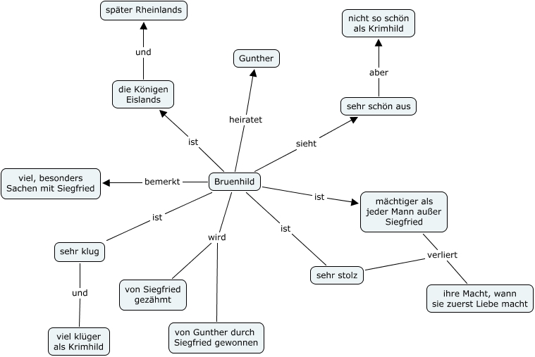 This Concept Map, created with IHMC CmapTools, has information related to: Bruenhild, sehr stolz verliert ihre Macht, wann sie zuerst Liebe macht, Bruenhild ist die Königen Eislands, mächtiger als jeder Mann außer Siegfried verliert ihre Macht, wann sie zuerst Liebe macht, Bruenhild sieht sehr schön aus, sehr klug und viel klüger als Krimhild, Bruenhild bemerkt viel, besonders Sachen mit Siegfried, Bruenhild ist mächtiger als jeder Mann außer Siegfried, Bruenhild heiratet Gunther, Bruenhild wird von Siegfried gezähmt, Bruenhild ist sehr stolz, Bruenhild ist sehr klug, sehr schön aus aber nicht so schön als Krimhild, die Königen Eislands und später Rheinlands, Bruenhild wird von Gunther durch Siegfried gewonnen