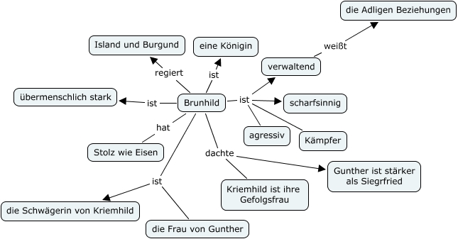 This Concept Map, created with IHMC CmapTools, has information related to: Brunhild, Brunhild hat Stolz wie Eisen, Brunhild ist agressiv, Brunhild dachte Gunther ist stärker als Siegrfried, Brunhild ist scharfsinnig, Brunhild ist eine Königin, verwaltend weißt die Adligen Beziehungen, Brunhild ist die Schwägerin von Kriemhild, Brunhild ist verwaltend, Brunhild dachte Kriemhild ist ihre Gefolgsfrau, Brunhild ist die Frau von Gunther, Brunhild regiert Island und Burgund, Brunhild ist Kämpfer, Brunhild ist übermenschlich stark