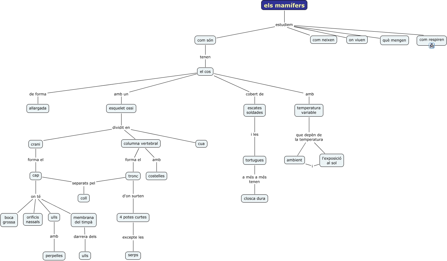 mamifers_1, esquelet ossi dividit en columna vertebral, tronc d'on surten 4 potes curtes, 4 potes curtes excepte les serps, els mamífers estudiem com respiren, escates soldades i les tortugues, esquelet ossi dividit en crani, columna vertebral amb costelles, cap separats pel coll, cap on té orificis nassals, cap on té boca grossa