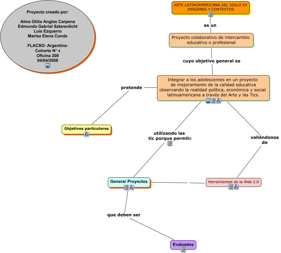 Este Cmap, tiene información relacionada con: Coloquio FLACSO, Integrar a los adolescentes en un proyecto de mejoramiento de la calidad educativa observando la realidad política, económica y social latinoamericana a través del Arte y las Tics. utilizando las tic porque permite Generar Proyectos, ARTE LATINOAMERICANA DEL SIGLO XX IMÁGENES Y CONTEXTOS es un Proyecto colaborativo de intercambio educativo o profesional, Generar Proyectos, Integrar a los adolescentes en un proyecto de mejoramiento de la calidad educativa observando la realidad política, económica y social latinoamericana a través del Arte y las Tics. valiéndonos de Herramientas de la Web 2.0, Proyecto colaborativo de intercambio educativo o profesional cuyo objetivo general es Integrar a los adolescentes en un proyecto de mejoramiento de la calidad educativa observando la realidad política, económica y social latinoamericana a través del Arte y las Tics., Generar Proyectos que deben ser Evaluados, Integrar a los adolescentes en un proyecto de mejoramiento de la calidad educativa observando la realidad política, económica y social latinoamericana a través del Arte y las Tics. pretende Objetivos particulares