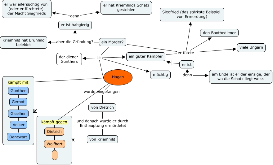 This Concept Map, created with IHMC CmapTools, has information related to: Hagen, mächtig denn er ist, ein Mörder? aber die Gründung? Kriemhild hat Brünhild beleidet, Hagen kämpft mit Gunther, er ist habgierig denn er hat Kriemhilds Schatz gestohlen, ein Mörder? er tötete den Bootbediener, er ist habgierig denn er war eifersüchtig von (oder er fürchtete) der Macht Siegfrieds, ein Mörder? er tötete Siegfried (das stärkste Beispiel von Ermordung), Hagen kämpft mit Volker, ein Mörder? ist ein guter Kämpfer, ein Mörder? aber die Gründung? er ist habgierig, ein guter Kämpfer er tötete viele Ungarn, Hagen kämpft mit Dancwart, von Dietrich und danach wurde er durch Enthauptung ermördetet von Kriemhild, Hagen kämpft mit Gernot, ein Mörder? ist der diener Gunthers, Hagen kämpft gegen, Hagen kämpft gegen Dietrich, ein guter Kämpfer er tötete Siegfried (das stärkste Beispiel von Ermordung), ein Mörder? ist Hagen, Hagen wurde eingefangen von Dietrich