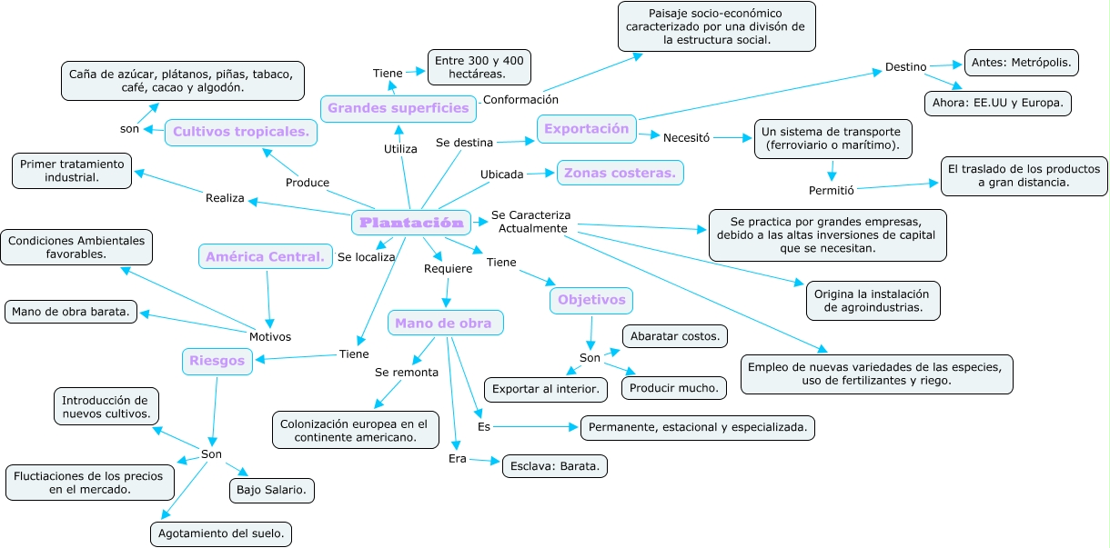 Este mapa conceptual tiene información relacionada a: Plantación- Sonia Sofía 3°3°, Plantación Ubicada Zonas costeras., América Central. Motivos Mano de obra barata., Plantación Se Caracteriza Actualmente Empleo de nuevas variedades de las especies, uso de fertilizantes y riego., Plantación Se localiza América Central., Plantación Tiene Objetivos, Objetivos Son Exportar al interior., Riesgos Son Fluctiaciones de los precios en el mercado., Exportación Necesitó Un sistema de transporte (ferroviario o marítimo)., Cultivos tropicales. son Caña de azúcar, plátanos, piñas, tabaco, café, cacao y algodón., Mano de obra Era Esclava: Barata.