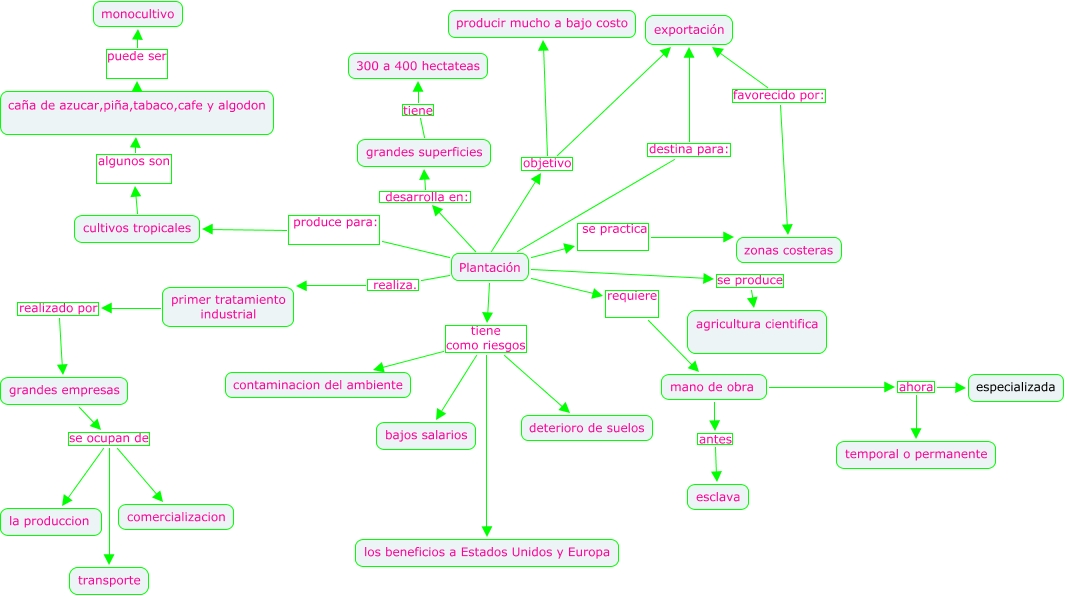 Este mapa conceptual tiene información relacionada a: plantacion victoria torales. yamila peralta.3°3°, Plantación objetivo producir mucho a bajo costo, mano de obra ahora temporal o permanente, Plantación objetivo exportación, Plantación requiere mano de obra, Plantación tiene como riesgos contaminacion del ambiente, Plantación se practica zonas costeras, grandes empresas se ocupan de transporte, Plantación tiene como riesgos bajos salarios, caña de azucar,piña,tabaco,cafe y algodon puede ser monocultivo, Plantación realiza. primer tratamiento industrial