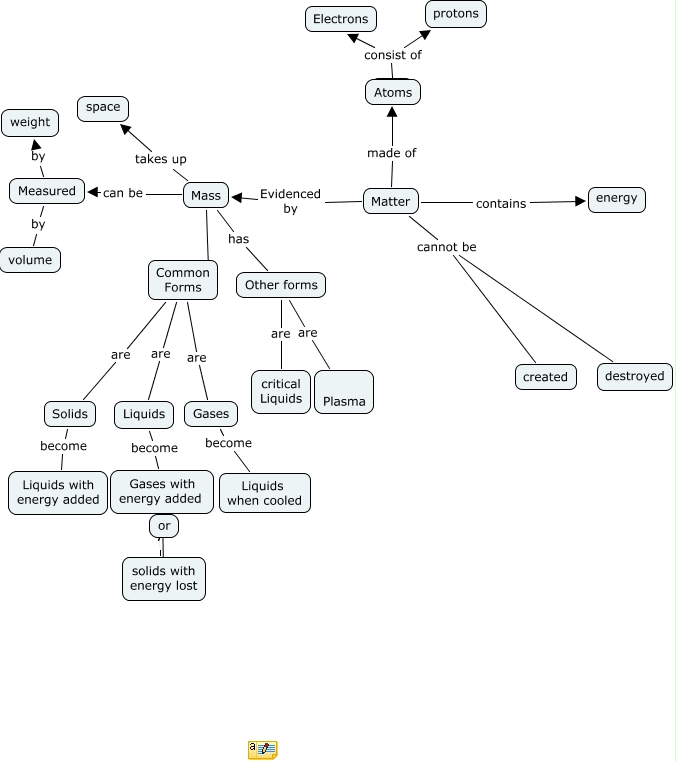This Concept Map has information related to: Jane Roger m2, Gases become Liquids when cooled, Matter made of ????, Solids become Liquids with energy added, Matter Evidenced by Mass, Common Forms are Gases, Mass has Common Forms, Atoms consist of Electrons, Other forms are critical Liquids, Mass has Other forms, Matter contains energy