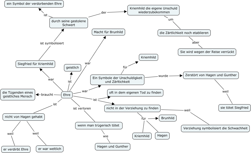 This Concept Map, created with IHMC CmapTools, has information related to: Ehre, Siegfried für Kriemhild ist symbolisiert durch seine gestolene Schwert, nicht in der Verziehung zu finden weil Verziehung symbolisiert die Schwachheit, Ein Symbole der Unschuldigkeit und Zärltichkeit wurde Zerstört von Hagen und Gunther, Ehre ist nicht in der Verziehung zu finden, Ehre braucht die Tügenden eines geistliches Mensch, wenn man trügerisch tötet wie Hagen und Gunther, nicht in der Verziehung zu finden für Brunhild, Ehre war Macht für Brunhild, Ehre war Siegfried für Kriemhild, durch seine gestolene Schwert ist ein Symbol der verdorbenden Ehre, Ein Symbole der Unschuldigkeit und Zärltichkeit für Kriemhild, Ehre ist verloren wenn man trügerisch tötet, Ehre ist nicht von Hagen gehabt, Kriemhild die eigene Unschuld wiederzubekommen um die Zärtlichkeit noch etablieren, Ehre war Ein Symbole der Unschuldigkeit und Zärltichkeit, nicht in der Verziehung zu finden für Hagen, durch seine gestolene Schwert der Kriemhild die eigene Unschuld wiederzubekommen, Zerstört von Hagen und Gunther weil sie tötet Siegfried, Ehre ist oft in dem eigenen Tod zu finden, die Zärtlichkeit noch etablieren aber Sie wird wegen der Reise verrückt