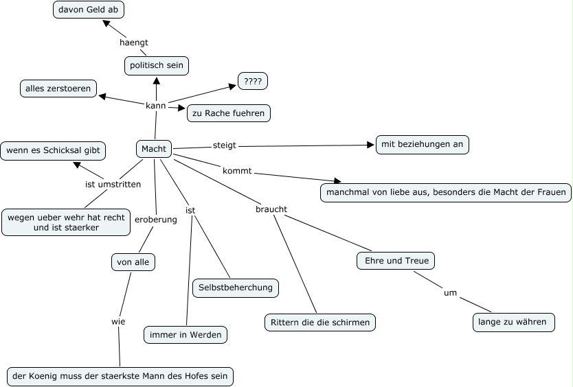 This Concept Map, created with IHMC CmapTools, has information related to: Macht, Macht ist immer in Werden, von alle wie der Koenig muss der staerkste Mann des Hofes sein, Macht eroberung von alle, Macht braucht Ehre und Treue, politisch sein haengt davon Geld ab, Macht kann alles zerstoeren, Macht ist Selbstbeherchung, Macht kann ????, Macht braucht Rittern die die schirmen, Macht ist umstritten wegen ueber wehr hat recht und ist staerker, Macht kann zu Rache fuehren, Macht kann politisch sein, Macht steigt mit beziehungen an, Ehre und Treue um lange zu währen, Macht ist umstritten wenn es Schicksal gibt, Macht kommt manchmal von liebe aus, besonders die Macht der Frauen