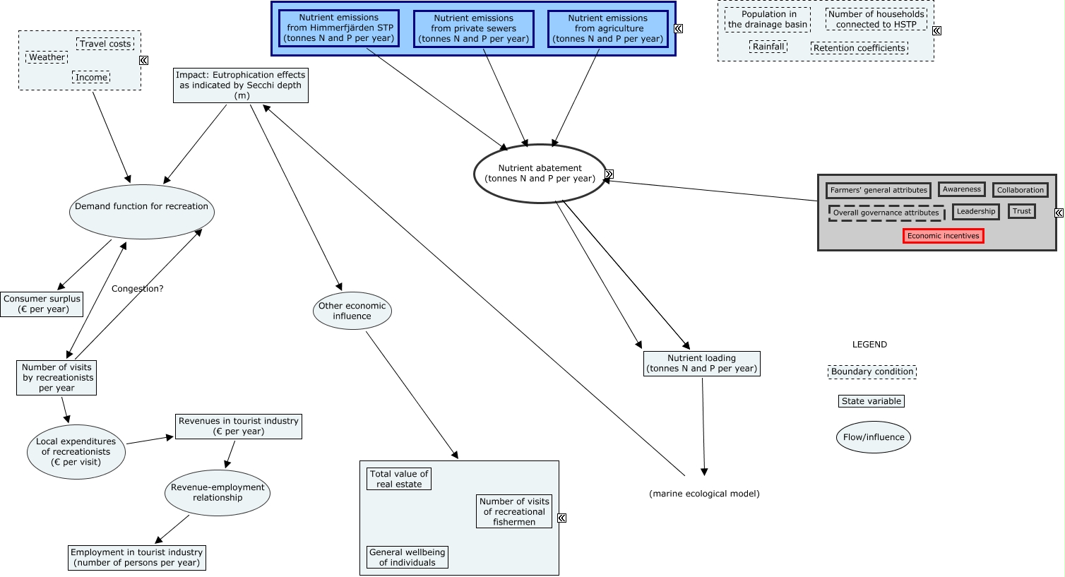 Den här kartan innehåller information om: Overall_economic_social_Berlin, Revenues in tourist industry (€ per year) Revenue-employment relationship Employment in tourist industry (number of persons per year), Number of visits by recreationists per year Local expenditures of recreationists (€ per visit) Revenues in tourist industry (€ per year), Nutrient loading (tonnes N and P per year) (marine ecological model) Impact: Eutrophication effects as indicated by Secchi depth (m), Impact: Eutrophication effects as indicated by Secchi depth (m) Demand function for recreation Number of visits by recreationists per year, Number of visits by recreationists per year Demand function for recreation Consumer surplus (€ per year), Nutrient emissions from agriculture (tonnes N and P per year) Participation function (wetland and riparian zones) Nutrient loading (tonnes N and P per year), Impact: Eutrophication effects as indicated by Secchi depth (m) Other economic influence Other economic state variables, Nutrient emissions from Himmerfjärden STP (tonnes N and P per year) Abatement function STP Nutrient loading (tonnes N and P per year), Boundary conditions for recreational demand Demand function for recreation Consumer surplus (€ per year), Nutrient emissions from private sewers (tonnes N and P per year) Abatement function private sewers Nutrient loading (tonnes N and P per year), Boundary conditions for recreational demand Demand function for recreation Number of visits by recreationists per year, Governance structure and social arrangements Participation function (wetland and riparian zones) Nutrient loading (tonnes N and P per year), Impact: Eutrophication effects as indicated by Secchi depth (m) Demand function for recreation Consumer surplus (€ per year)