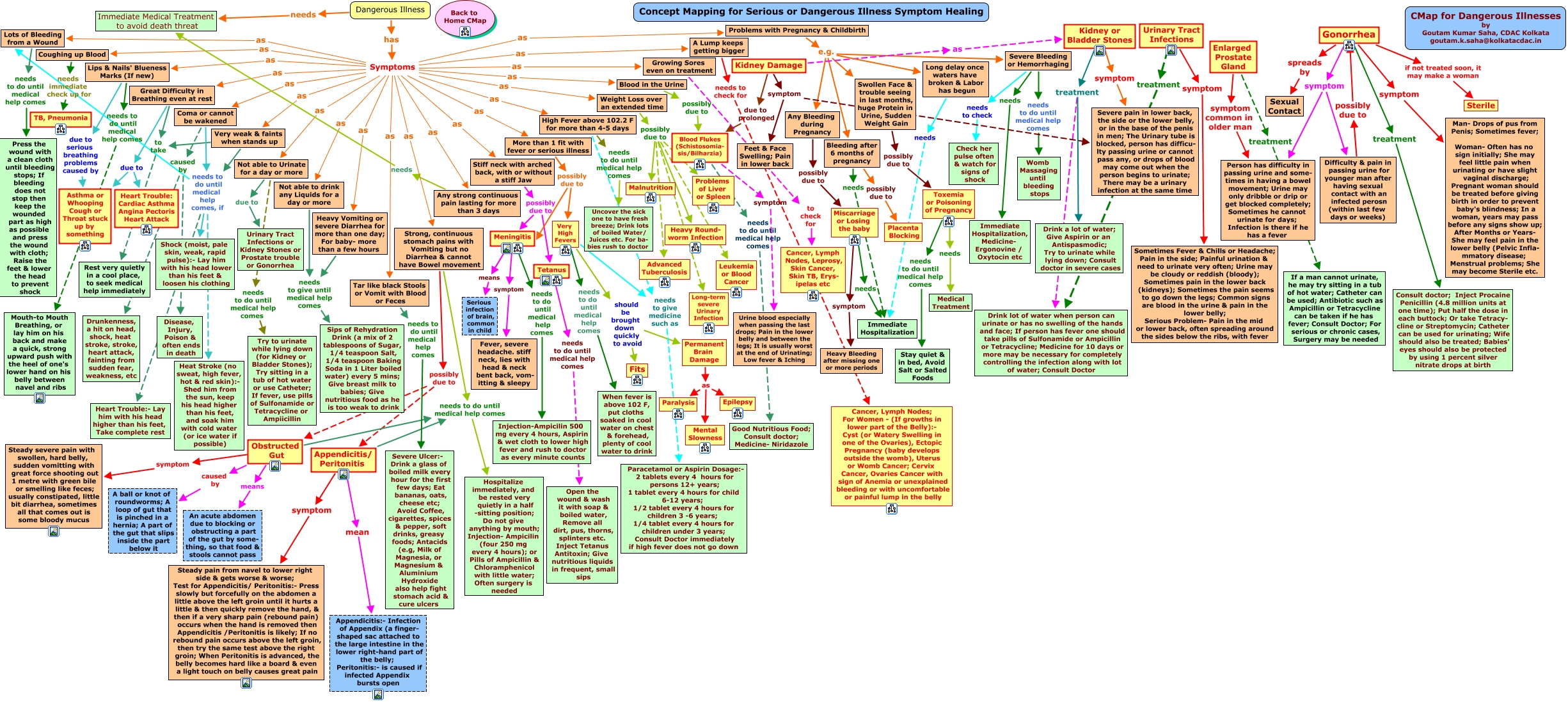This Concept Map has information related to: Serious Illness Symptom Healing, Very High Fevers needs to give medicine such as Paracetamol or Aspirin Dosage:- 2 tablets every 4 hours for persons 12+ years; 1 tablet every 4 hours for child 6-12 years; 1/2 tablet every 4 hours for children 3 -6 years; 1/4 tablet every 4 hours for children under 3 years; Consult Doctor immediately if high fever does not go down, Problems with Pregnancy & Childbirth e.g. Swollen Face & trouble seeing in last months, huge Protein in Urine, Sudden Weight Gain, Problems with Pregnancy & Childbirth e.g. Any Bleeding during Pregnancy, Very High Fevers needs to do until medical help comes When fever is above 102 F, put cloths soaked in cool water on chest & forehead, plenty of cool water to drink, Tar like black Stools or Vomit with Blood or Feces needs to do until medical help comes Severe Ulcer:- Drink a glass of boiled milk every hour for the first few days; Eat bananas, oats, cheese etc; Avoid Coffee, cigarettes, spices & pepper, soft drinks, greasy foods; Antacids (e.g, Milk of Magnesia, or Magnesium & Aluminium Hydroxide also help fight stomach acid & cure ulcers, High Fever above 102.2 F for more than 4-5 days needs to do until medical help comes Uncover the sick one to have fresh breeze; Drink lots of boiled Water/ Juices etc. For ba- bies rush to doctor, Severe Bleeding or Hemorrhaging needs Immediate Hospitalization, Medicine- Ergonovine / Oxytocin etc, Not able to Urinate for a day or more due to Urinary Tract Infections or Kidney Stones or Prostate trouble or Gonorrhea, Great Difficulty in Breathing even at rest due to Heart Trouble: Cardiac Asthma Angina Pectoris Heart Attack, Coma or cannot be wakened caused by Drunkenness, a hit on head, shock, heat stroke, stroke, heart attack, fainting from sudden fear, weakness, etc
