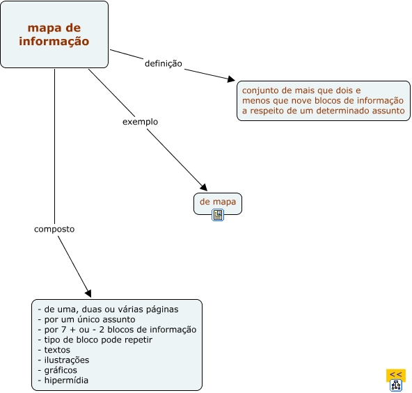 Esse mapa conceitual, produzido no IHMC CmapTools, tem a informação relacionada a: mapa_de_informacao, mapa de informação exemplo de mapa, mapa de informação definição conjunto de mais que dois e menos que nove blocos de informação a respeito de um determinado assunto, mapa de informação composto - de uma, duas ou várias páginas - por um único assunto - por 7 + ou - 2 blocos de informação - tipo de bloco pode repetir - textos - ilustrações - gráficos - hipermídia