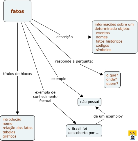 Esse mapa conceitual, produzido no IHMC CmapTools, tem a informação relacionada a: mapa_fatos, fatos responde à pergunta: o que? onde? quem?, fatos títulos de blocos introdução nome relação dos fatos tabelas gráficos, fatos descrição informações sobre um determinado objeto: eventos nomes fatos históricos códigos símbolos, o Brasil foi descoberto por ... dê um exemplo? não possui, fatos exemplo não possui, fatos exemplo de conhecimento factual o Brasil foi descoberto por ...
