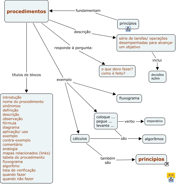 Esse mapa conceitual, produzido no IHMC CmapTools, tem a informação relacionada a: mapa_procedimentos, procedimentos exemplo cálculos, coloque ... pegue ... levante ... são algorítmos, série de tarefas/ operações desempenhadas para alcançar um objetivo inclui decisões ações, coloque ... pegue ... levante ... verbo imperativo, procedimentos exemplo fluxograma, cálculos são algorítmos, procedimentos responde à pergunta: o que devo fazer? como é feito?, procedimentos títulos de blocos introdução nome do procedimento sinônimos definição descrição observação fórmula diagrama aplicação/ uso exemplo contra-exemplo comentário analogia mapas relacionados (links) tabela do procedimento fluxograma algorítmo lista de verificação quando fazer quando não fazer, princípios fundamentam procedimentos, procedimentos descrição série de tarefas/ operações desempenhadas para alcançar um objetivo, cálculos também são princípios, procedimentos exemplo coloque ... pegue ... levante ...