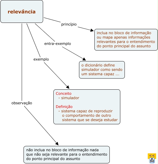 Esse mapa conceitual, produzido no IHMC CmapTools, tem a informação relacionada a: principio_relevancia, relevância exemplo Conceito - simulador Definição - sistema capaz de reproduzir o comportamento de outro sistema que se deseja estudar, relevância princípio inclua no bloco de informação ou mapa apenas informações relevantes para o entendimento do ponto principal do assunto, relevância entra-exemplo o dicionário define simulador como sendo um sistema capaz ..., relevância observação não inclua no bloco de informação nada que não seja relevante para o entendimento do ponto principal do assunto