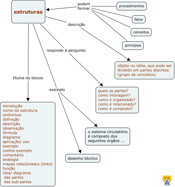Esse mapa conceitual, produzido no IHMC CmapTools, tem a informação relacionada a: mapa_estrutura, estruturas responde à pergunta: quais as partes? como interagem? como é organizado? como é relacionado? como é composto?, estruturas títulos de blocos introdução nome da estrutura sinônimos definição descrição observação fórmula diagrama aplicação/ uso exemplo contra-exemplo comentário analogia mapas relacionados (links) função lista/ diagrama das partes das sub partes, estruturas exemplo o sistema circulatório é composto dos seguintes órgãos ..., procedimentos podem formar estruturas, estruturas descrição objeto ou idéia, que pode ser dividido em partes distintas (grupo de conceitos), fatos podem formar estruturas, conceitos podem formar estruturas, princípios podem formar estruturas, estruturas exemplo desenho técnico