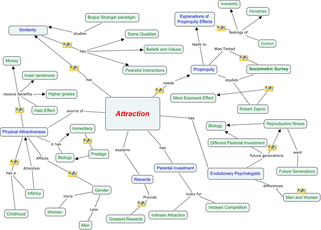This Concept Map, created with IHMC CmapTools, has information related to: Attraction, Reproductive fitness ???? Biology, Similarity has Same Qualities, Physical Attractiveness has a Infancy, Explanations of Propinquity Effects feelings of Comfort, Attraction has Parental Investment, Parental Investment looks for Intersex Attraction, Explanations of Propinquity Effects feelings of Availability, Sociometric Survey studies Robert Zajonc, Physical Attractiveness it has Immediacy, Physical Attractiveness receive Benefits lower sentences, Physical Attractiveness receive Benefits Higher grades, Physical Attractiveness has a Childhood, Similarity has Peaceful Interactions, Gender Less Men, Gender more Women, Parental Investment looks for Intrasex Competition, Evolutionary Psychologists future generations Reproductive fitness, Rewards Provide Greatest Rewards, Attraction has Similarity, Attraction needs Propinquity