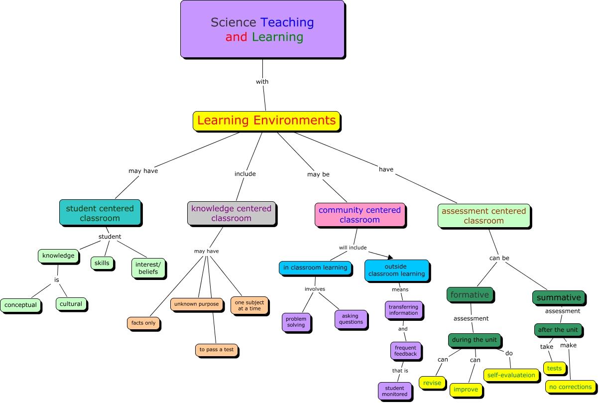 This Concept Map has information related to: Gonzales st2, knowledge centered classroom may have unknown purpose, community centered classroom will include in classroom learning, Learning Environments may be community centered classroom, student centered classroom student knowledge, knowledge centered classroom may have one subject at a time, Learning Environments have assessment centered classroom, during the unit can revise, assessment centered classroom can be summative, summative assessment after the unit, after the unit take tests