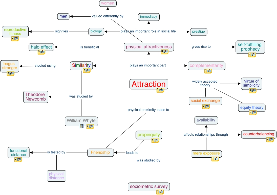 This Concept Map, created with IHMC CmapTools, has information related to: Attraction, Friendship is tested by physical distance, Attraction plays an important part Similarity, Attraction plays an important part complementarity, physical attractiveness plays an important role in social life prestige, Similarity was studied by Theodore Newcomb, Attraction physical proximity leads to Friendship, Friendship is tested by functional distance, Attraction widely accepted theory virtue of simplicity, physical attractiveness is beneficial halo effect, physical attractiveness plays an important role in social life immediacy, propinquity was studied by sociometric survey, Similarity was studied by William Whyte, physical attractiveness valued differently by women, Similarity studied using bogus stranger, physical attractiveness valued differently by men, propinquity affects relationships through counterbalancing, propinquity affects relationships through availability, propinquity leads to Friendship, physical attractiveness gives rise to self-fulfilling prophecy, Attraction plays an important part physical attractiveness
