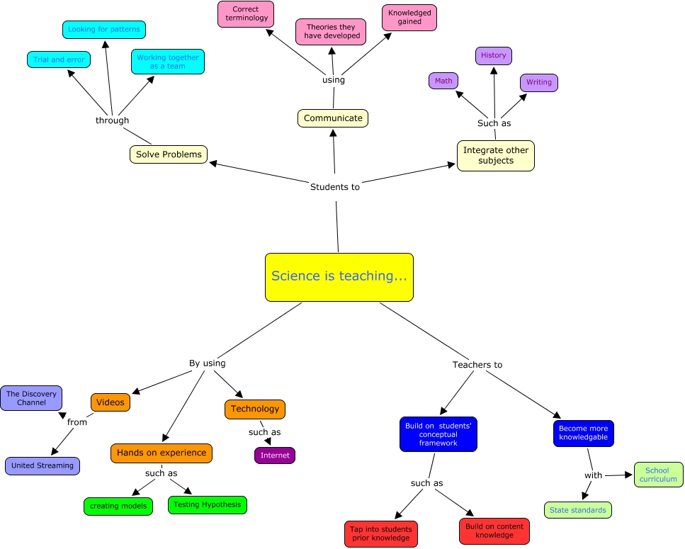 This Concept Map, created with IHMC CmapTools, has information related to: Morales st2, Technology such as Internet, Integrate other subjects Such as History, Become more knowledgable with State standards, Science is teaching... By using Technology, Science is teaching... Teachers to Build on students' conceptual framework, Communicate using Correct terminology, Science is teaching... Teachers to Become more knowledgable, Communicate using Theories they have developed, Hands on experience such as Testing Hypothesis, Become more knowledgable with School curriculum, Solve Problems through Looking for patterns, Videos from United Streaming, Science is teaching... Students to Integrate other subjects, Science is teaching... Students to Communicate, Science is teaching... By using Hands on experience, Communicate using Knowledged gained, Hands on experience such as creating models, Build on students' conceptual framework such as Tap into students prior knowledge, Videos from The Discovery Channel, Integrate other subjects Such as Math