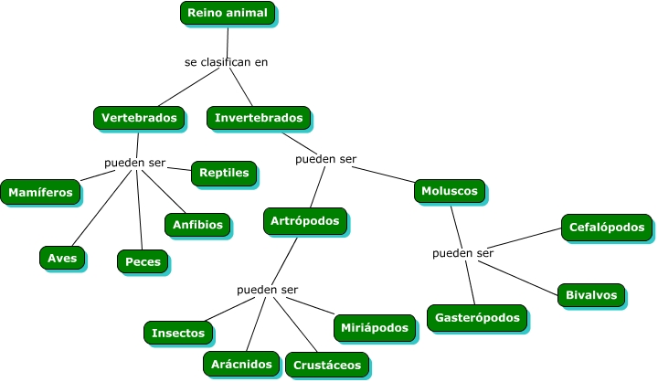 Este Cmap, tiene información relacionada con: Seres vivos, Reino animal se clasifican en Invertebrados, Artrópodos pueden ser Arácnidos, Gasterópodos pueden ser Bivalvos, Vertebrados pueden ser Aves, Vertebrados pueden ser Reptiles, Vertebrados pueden ser Peces, Gasterópodos pueden ser Cefalópodos, Vertebrados pueden ser Anfibios, Artrópodos pueden ser Insectos, Artrópodos pueden ser Miriápodos, Invertebrados pueden ser Artrópodos, Reino animal se clasifican en Vertebrados, Vertebrados pueden ser Mamíferos, Invertebrados pueden ser Moluscos, Artrópodos pueden ser Crustáceos, Gasterópodos pueden ser Moluscos