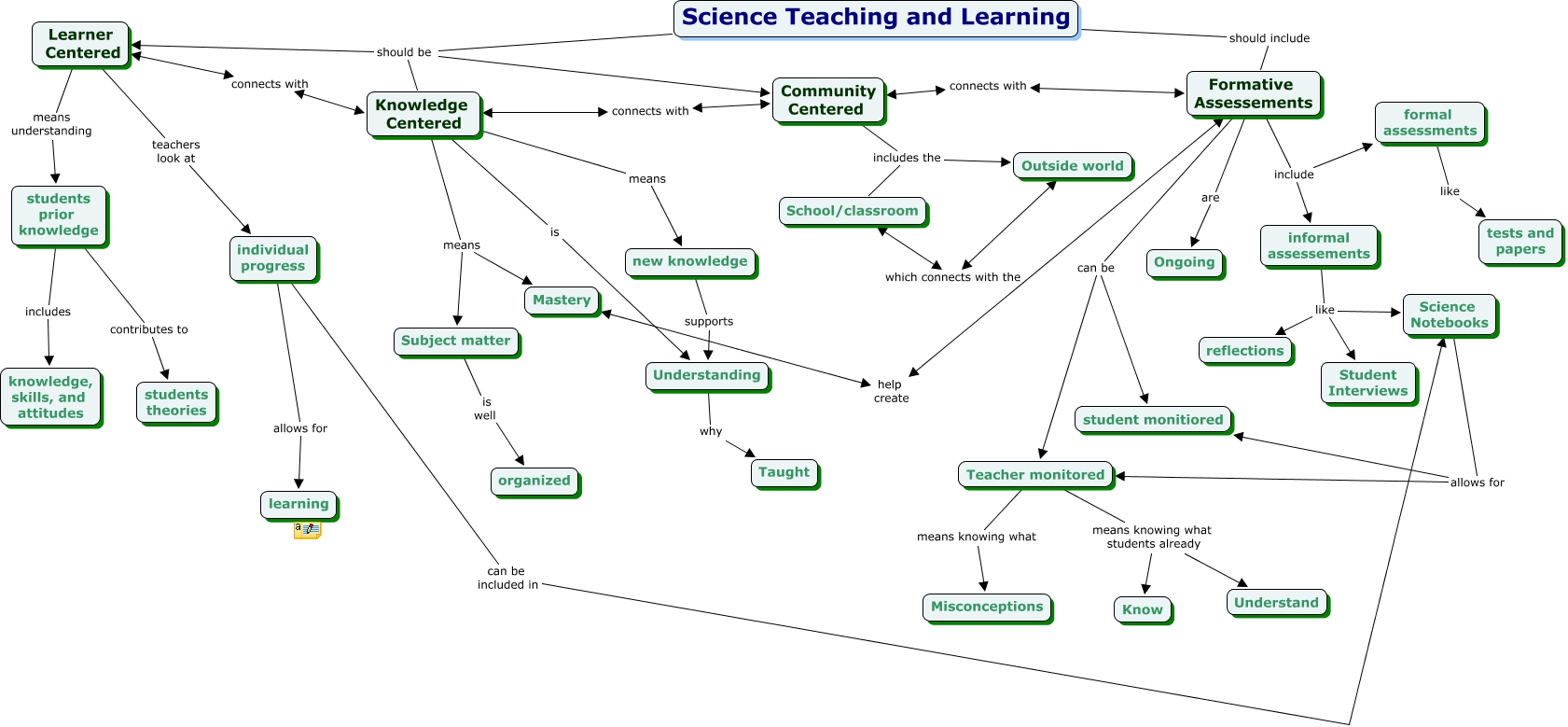 This Concept Map, created with IHMC CmapTools, has information related to: Fallaha st2, Formative Assessements include informal assessements, Science Teaching and Learning should be Knowledge Centered, Learner Centered connects with Knowledge Centered, Knowledge Centered means new knowledge, School/classroom which connects with the Outside world, individual progress allows for learning, Subject matter is well organized, Knowledge Centered connects with Community Centered, Knowledge Centered is Understanding, Community Centered includes the School/classroom, Community Centered includes the Outside world, Formative Assessements include formal assessments, Science Notebooks allows for student monitiored, individual progress can be included in Science Notebooks, Formative Assessements can be student monitiored, Teacher monitored means knowing what students already Know, Science Teaching and Learning should include Formative Assessements, Learner Centered teachers look at individual progress, informal assessements like Student Interviews, new knowledge supports Understanding