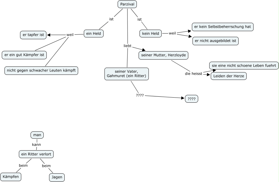 This Concept Map, created with IHMC CmapTools, has information related to: Tristan, Parzival liebt seiner Mutter, Herzloyde, Parzival ist ein Held, ein Ritter verlort beim Jagen, seiner Mutter, Herzloyde die heisst sie eine nicht schoene Leben fuehrt, Parzival liebt seiner Vater, Gahmuret (ein Ritter), ein Held weil nicht gegen schwacher Leuten kämpft, ein Ritter verlort beim Kämpfen, ein Held weil er ein gut Kämpfer ist, seiner Vater, Gahmuret (ein Ritter) ???? ????, ein Held weil er tapfer ist, man kann ein Ritter verlort, kein Held weil er kein Selbstbeherrschung hat, kein Held weil er nicht ausgebildet ist, Parzival ist kein Held, seiner Mutter, Herzloyde die heisst Leiden der Herze