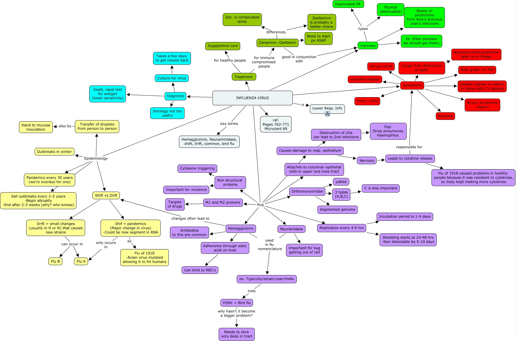 This Concept Map, created with IHMC CmapTools, has information related to: 02i. Influenza Virus, INFLUENZA VIRUS bug Causes damage to resp. epithelium, Drift = small changes (usually in H or N) that causes new strains can occur in Flu B, Symptoms Reye's Syndrome -Aspirin, Causes damage to resp. epithelium Necrosis, Leads to cytokine release responsible for Symptoms, INFLUENZA VIRUS Treatment, Adherence through sialic acidi on host Can bind to RBC's, Causes damage to resp. epithelium Destruction of cilia can lead to 2nd infections, INFLUENZA VIRUS bug Non structural proteins, Diagnosis Serology not too useful, INFLUENZA VIRUS Epidemiology Transfer of droplets from person to person, Vaccines Dr. Elder stresses we should get them\, Cough from destruction of epith. Becomes more prominent later on in illness, INFLUENZA VIRUS Epidemiology Sall outbreaks every 2-3 years -Begin abruptly -End after 2-3 weeks (why? who knows), INFLUENZA VIRUS Epidemiology Pandemics every 30 years (we're overdue for one), Hemagglutinin Adherence through sialic acidi on host, Symptoms Abrupt onset, INFLUENZA VIRUS Epidemiology Shift vs Drift, Symptoms Deaths highest in elderly or those with CV disease, Zanamivir, Oseltamir good in conjunction with Vaccines