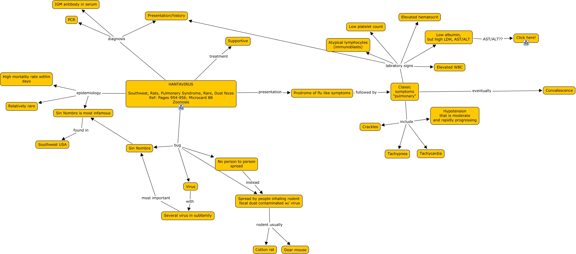 This Concept Map, created with IHMC CmapTools, has information related to: 05h. Hantavirus, Classic symptoms "pulmonary" eventually Convalescence, HANTAVIRUS Southwest, Rats, Pulmonary Syndrome, Rare, Dust feces Ref: Pages 954-956; Microcard 88 Zoonosis epidemiology High mortality rate within days, Classic symptoms "pulmonary" include Hypotension that is moderate and rapidly progressing, HANTAVIRUS Southwest, Rats, Pulmonary Syndrome, Rare, Dust feces Ref: Pages 954-956; Microcard 88 Zoonosis diagnosis PCR, HANTAVIRUS Southwest, Rats, Pulmonary Syndrome, Rare, Dust feces Ref: Pages 954-956; Microcard 88 Zoonosis bug Spread by people inhaling rodent fecal dust contaminated w/ virus, Several virus in subfamily most important Sin Nombre, Low albumin, but high LDH, AST/ALT AST/ALT?? Click here!, Classic symptoms "pulmonary" labratory signs Elevated WBC, Classic symptoms "pulmonary" include Tachycardia, HANTAVIRUS Southwest, Rats, Pulmonary Syndrome, Rare, Dust feces Ref: Pages 954-956; Microcard 88 Zoonosis epidemiology Sin Nombre is most infamous, Virus with Several virus in subfamily, HANTAVIRUS Southwest, Rats, Pulmonary Syndrome, Rare, Dust feces Ref: Pages 954-956; Microcard 88 Zoonosis treatment Supportive, Classic symptoms "pulmonary" labratory signs Atypical lymphocytes (immunoblasts), HANTAVIRUS Southwest, Rats, Pulmonary Syndrome, Rare, Dust feces Ref: Pages 954-956; Microcard 88 Zoonosis diagnosis Presentation/history, HANTAVIRUS Southwest, Rats, Pulmonary Syndrome, Rare, Dust feces Ref: Pages 954-956; Microcard 88 Zoonosis presentation Prodrome of flu like symptoms, Classic symptoms "pulmonary" include Tachypnea, HANTAVIRUS Southwest, Rats, Pulmonary Syndrome, Rare, Dust feces Ref: Pages 954-956; Microcard 88 Zoonosis bug No person to person spread, HANTAVIRUS Southwest, Rats, Pulmonary Syndrome, Rare, Dust feces Ref: Pages 954-956; Microcard 88 Zoonosis bug Virus, HANTAVIRUS Southwest, Rats, Pulmonary Syndrome, Rare, Dust feces Ref: Pages 954-956; Microcard 88 Zoonosis diagnosis IGM antibody in serum, Classic symptoms "pulmonary" labratory signs Elevated hematocrit