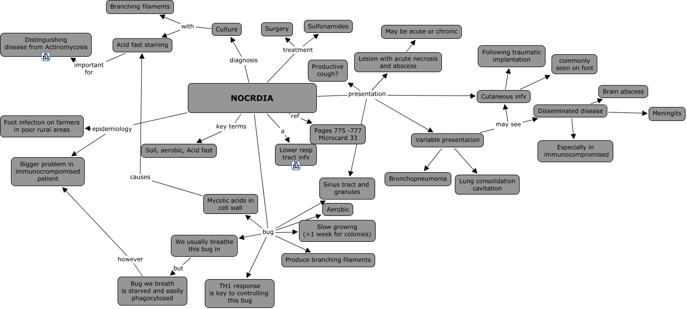 This Concept Map, created with IHMC CmapTools, has information related to: 02k. Nocardia, NOCRDIA presentation Sinus tract and granules, Disseminated disease Meningits, Disseminated disease Especially in immunocompromised, NOCRDIA presentation Variable presentation, NOCRDIA treatment Sulfonamides, Culture with Branching filaments, NOCRDIA ref Pages 775 -777 Microcard 33, Cutaneous infx Following traumatic implantation, NOCRDIA bug Sinus tract and granules, NOCRDIA bug TH1 response is key to controlling this bug, NOCRDIA a Lower resp tract infx, Culture with Acid fast staining, NOCRDIA presentation Lesion with acute necrosis and abscess, NOCRDIA bug Mycolic acids in cell wall, NOCRDIA presentation Cutaneous infx, NOCRDIA bug Aerobic, NOCRDIA treatment Surgery, NOCRDIA epidemiology Foot infection on farmers in poor rural areas, NOCRDIA key terms Soil, aerobic, Acid fast, NOCRDIA epidemiology Bigger problem in immunocrompomised patient