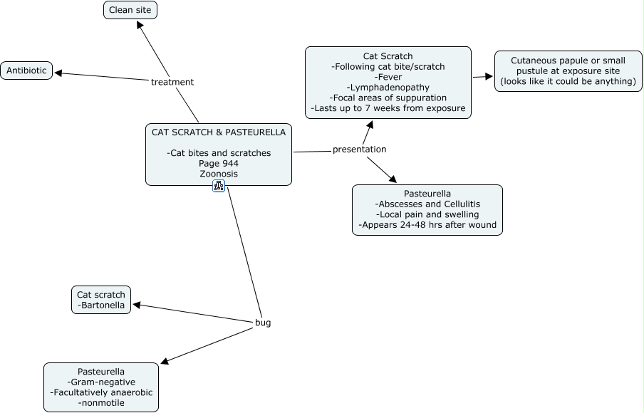This Concept Map, created with IHMC CmapTools, has information related to: 05d. Cat-Scratch & Pasteurella, CAT SCRATCH & PASTEURELLA -Cat bites and scratches Page 944 Zoonosis treatment Clean site, CAT SCRATCH & PASTEURELLA -Cat bites and scratches Page 944 Zoonosis presentation Cat Scratch -Following cat bite/scratch -Fever -Lymphadenopathy -Focal areas of suppuration -Lasts up to 7 weeks from exposure, CAT SCRATCH & PASTEURELLA -Cat bites and scratches Page 944 Zoonosis treatment Antibiotic, Cat Scratch -Following cat bite/scratch -Fever -Lymphadenopathy -Focal areas of suppuration -Lasts up to 7 weeks from exposure Cutaneous papule or small pustule at exposure site (looks like it could be anything), CAT SCRATCH & PASTEURELLA -Cat bites and scratches Page 944 Zoonosis bug Pasteurella -Gram-negative -Facultatively anaerobic -nonmotile, CAT SCRATCH & PASTEURELLA -Cat bites and scratches Page 944 Zoonosis bug Cat scratch -Bartonella, CAT SCRATCH & PASTEURELLA -Cat bites and scratches Page 944 Zoonosis presentation Pasteurella -Abscesses and Cellulitis -Local pain and swelling -Appears 24-48 hrs after wound