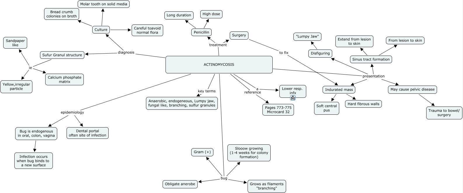 This Concept Map, created with IHMC CmapTools, has information related to: 02j. Actinomycosis, ACTINOMYCOSIS bug Gram (+), Sufur Granul structure ie Sandpaper like, Disfiguring "Lumpy Jaw", ACTINOMYCOSIS diagnosis Sufur Granul structure, Culture Careful toavoid normal flora, ACTINOMYCOSIS bug Obligate anerobe, Culture Molar tooth on solid media, ACTINOMYCOSIS presentation May cause pelvic disease, Bug is endogenous in oral, colon, vagina Infection occurs when bug binds to a new surface, ACTINOMYCOSIS presentation Sinus tract formation, ACTINOMYCOSIS presentation Indurated mass, Indurated mass Soft central pus, ACTINOMYCOSIS reference Pages 773-775 Microcard 32, ACTINOMYCOSIS a Lower resp. infx, ACTINOMYCOSIS treatment Penicillin, Penicillin Long duration, Penicillin High dose, Indurated mass Hard fibrous walls, ACTINOMYCOSIS bug Slooow growing (1-4 weeks for colony formation), ACTINOMYCOSIS epidemiology Dental portal often site of infection