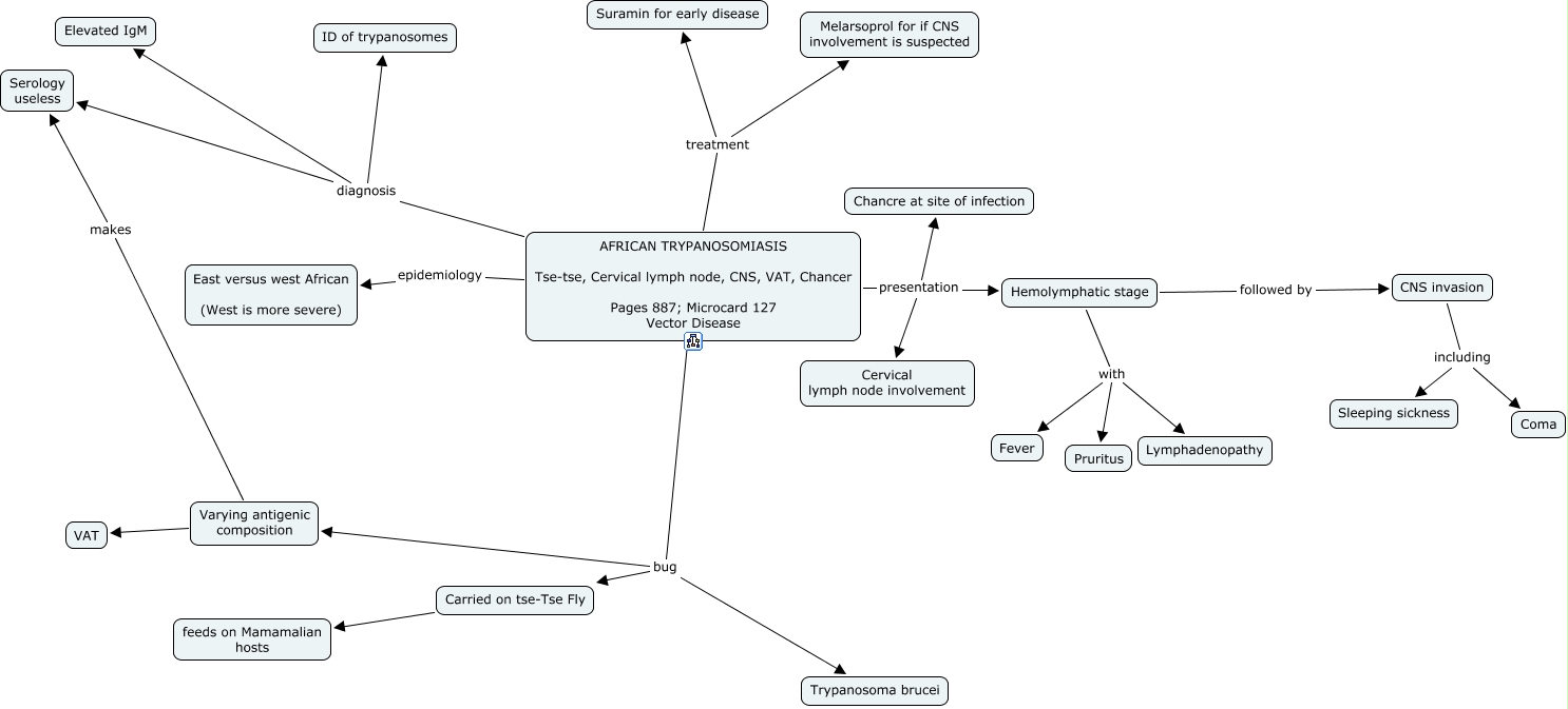 This Concept Map, created with IHMC CmapTools, has information related to: 04j. African Trypansomiasis, Varying antigenic composition VAT, AFRICAN TRYPANOSOMIASIS Tse-tse, Cervical lymph node, CNS, VAT, Chancer Pages 887; Microcard 127 Vector Disease bug Varying antigenic composition, AFRICAN TRYPANOSOMIASIS Tse-tse, Cervical lymph node, CNS, VAT, Chancer Pages 887; Microcard 127 Vector Disease diagnosis Elevated IgM, Carried on tse-Tse Fly feeds on Mamamalian hosts, Hemolymphatic stage with Pruritus, AFRICAN TRYPANOSOMIASIS Tse-tse, Cervical lymph node, CNS, VAT, Chancer Pages 887; Microcard 127 Vector Disease presentation Hemolymphatic stage, Hemolymphatic stage with Fever, AFRICAN TRYPANOSOMIASIS Tse-tse, Cervical lymph node, CNS, VAT, Chancer Pages 887; Microcard 127 Vector Disease presentation Chancre at site of infection, AFRICAN TRYPANOSOMIASIS Tse-tse, Cervical lymph node, CNS, VAT, Chancer Pages 887; Microcard 127 Vector Disease diagnosis Serology useless, CNS invasion including Coma, AFRICAN TRYPANOSOMIASIS Tse-tse, Cervical lymph node, CNS, VAT, Chancer Pages 887; Microcard 127 Vector Disease presentation Cervical lymph node involvement, AFRICAN TRYPANOSOMIASIS Tse-tse, Cervical lymph node, CNS, VAT, Chancer Pages 887; Microcard 127 Vector Disease epidemiology East versus west African (West is more severe), Hemolymphatic stage with Lymphadenopathy, AFRICAN TRYPANOSOMIASIS Tse-tse, Cervical lymph node, CNS, VAT, Chancer Pages 887; Microcard 127 Vector Disease treatment Suramin for early disease, AFRICAN TRYPANOSOMIASIS Tse-tse, Cervical lymph node, CNS, VAT, Chancer Pages 887; Microcard 127 Vector Disease diagnosis ID of trypanosomes, CNS invasion including Sleeping sickness, AFRICAN TRYPANOSOMIASIS Tse-tse, Cervical lymph node, CNS, VAT, Chancer Pages 887; Microcard 127 Vector Disease bug Trypanosoma brucei, Varying antigenic composition makes Serology useless, AFRICAN TRYPANOSOMIASIS Tse-tse, Cervical lymph node, CNS, VAT, Chancer Pages 887; Microcard 127 Vector Disease bug Carried on tse-Tse Fly, AFRICAN TRYPANOSOMIASIS Tse-tse, Cervical lymph node, CNS, VAT, Chancer Pages 887; Microcard 127 Vector Disease treatment Melarsoprol for if CNS involvement is suspected