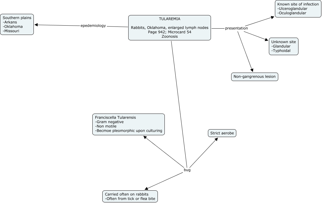 This Concept Map, created with IHMC CmapTools, has information related to: 05b. Tularemia, TULAREMIA Rabbits, Oklahoma, enlarged lymph nodes Page 942; Microcard 54 Zoonosis bug Franciscella Tularensis -Gram negative -Non motile -Becmoe pleomorphic upon culturing, TULAREMIA Rabbits, Oklahoma, enlarged lymph nodes Page 942; Microcard 54 Zoonosis presentation Unknown site -Glandular -Typhoidal, TULAREMIA Rabbits, Oklahoma, enlarged lymph nodes Page 942; Microcard 54 Zoonosis bug Strict aerobe, TULAREMIA Rabbits, Oklahoma, enlarged lymph nodes Page 942; Microcard 54 Zoonosis bug Carried often on rabbits -Often from tick or flea bite, TULAREMIA Rabbits, Oklahoma, enlarged lymph nodes Page 942; Microcard 54 Zoonosis epedemiology Southern plains -Arkans -Oklahoma -Missouri, TULAREMIA Rabbits, Oklahoma, enlarged lymph nodes Page 942; Microcard 54 Zoonosis presentation Known site of infection -Ulceroglandular -Oculoglandular, TULAREMIA Rabbits, Oklahoma, enlarged lymph nodes Page 942; Microcard 54 Zoonosis presentation Non-gangrenous lesion