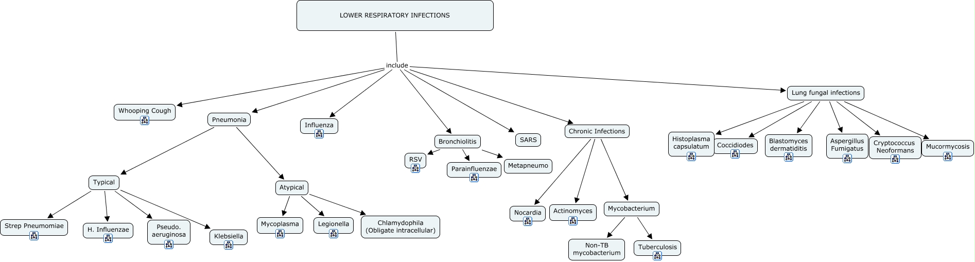 This Concept Map, created with IHMC CmapTools, has information related to: 02. Lower Respiratory Tract Infections, Bronchiolitis Metapneumo, LOWER RESPIRATORY INFECTIONS include Lung fungal infections, LOWER RESPIRATORY INFECTIONS include Pneumonia, Mycobacterium Non-TB mycobacterium, Bronchiolitis Parainfluenzae, Lung fungal infections Histoplasma capsulatum, Chronic Infections Mycobacterium, Chronic Infections Actinomyces, Lung fungal infections Blastomyces dermatiditis, Lung fungal infections Mucormycosis, Lung fungal infections Coccidiodes, LOWER RESPIRATORY INFECTIONS include Chronic Infections, Typical Klebsiella, Lung fungal infections Aspergillus Fumigatus, Typical H. Influenzae, Chronic Infections Nocardia, Bronchiolitis RSV, Atypical Chlamydophila (Obligate intracellular), Atypical Legionella, Typical Strep Pneumomiae