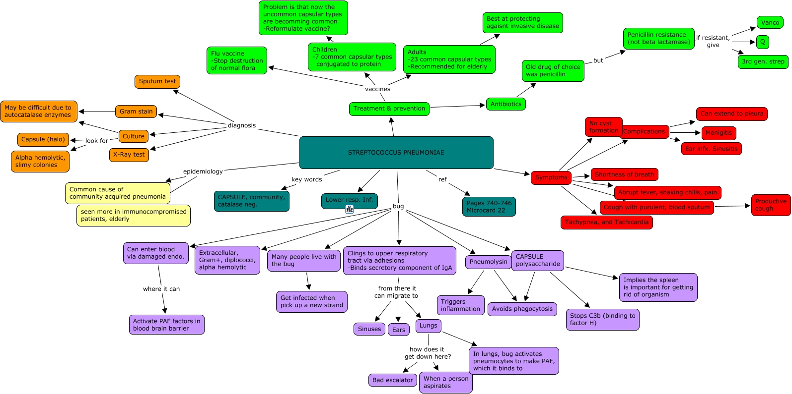 This Concept Map, created with IHMC CmapTools, has information related to: 02d. Streptococcus Pneumoniae, Culture May be difficult due to autocatalase enzymes, STREPTOCOCCUS PNEUMONIAE epidemiology Common cause of community acquired pneumonia, Cough with purulent, blood sputum Productive cough, Symptoms Shortness of breath, STREPTOCOCCUS PNEUMONIAE bug Can enter blood via damaged endo., Treatment & prevention vaccines Flu vaccine -Stop destruction of normal flora, CAPSULE polysaccharide Implies the spleen is important for getting rid of organism, Lungs In lungs, bug activates pneumocytes to make PAF, which it binds to, STREPTOCOCCUS PNEUMONIAE bug Extracellular, Gram+, diplococci, alpha hemolytic, Culture look for Alpha hemolytic, slimy colonies, Symptoms Cough with purulent, blood sputum, Many people live with the bug Get infected when pick up a new strand, Culture look for Capsule (halo), Complications Can extend to pleura, STREPTOCOCCUS PNEUMONIAE diagnosis X-Ray test, STREPTOCOCCUS PNEUMONIAE epidemiology seen more in immunocompromised patients, elderly, Antibiotics Old drug of choice was penicillin, STREPTOCOCCUS PNEUMONIAE diagnosis Culture, Gram stain May be difficult due to autocatalase enzymes, Pneumolysin Triggers inflammation