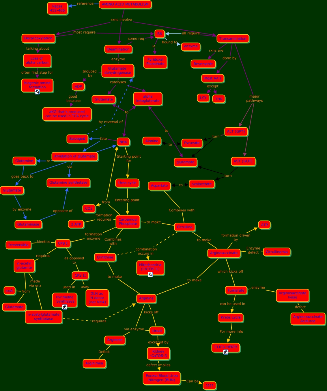 This Concept Map, created with IHMC CmapTools, has information related to: 04. Nitrogen reactions & urea, Fumarate enzyme Arginosuccinate lyase, Arginine via enzyme Arginase, Glutamine goes back to Glutamate, n-acetyl glutamte from Glutamate, Arginase Defect Arginimea, n-acetyl glutamte from coA, Glutamate dehydrogenase Induced by ADP, Decarboxylation talking about Loss of alpha carbon, AMINO ACID METABOLISM rxns involve Deamination, Arginosuccinate Enzyme defect Citrullinemia, Carbamoyl Phosphate formation requires 2 ATP, Glutamate dehydrogenase catalyses alpha ketogluterate, ALT (GPT) turn Pyruvate, Transamination rxns are Reversable, Kidney -CaTOS-3 defect implies Excess Blood Urea Nitrogen (BUN), Glutaminase opposite of Glutamine synthetase, Amidation of glutamate to Glutamine, Citrulline combination occurs in Mitochondria (CaTOS-1), Salvaged by reversal of Glutamate dehydrogenase, ALT (GPT) turn glutamate